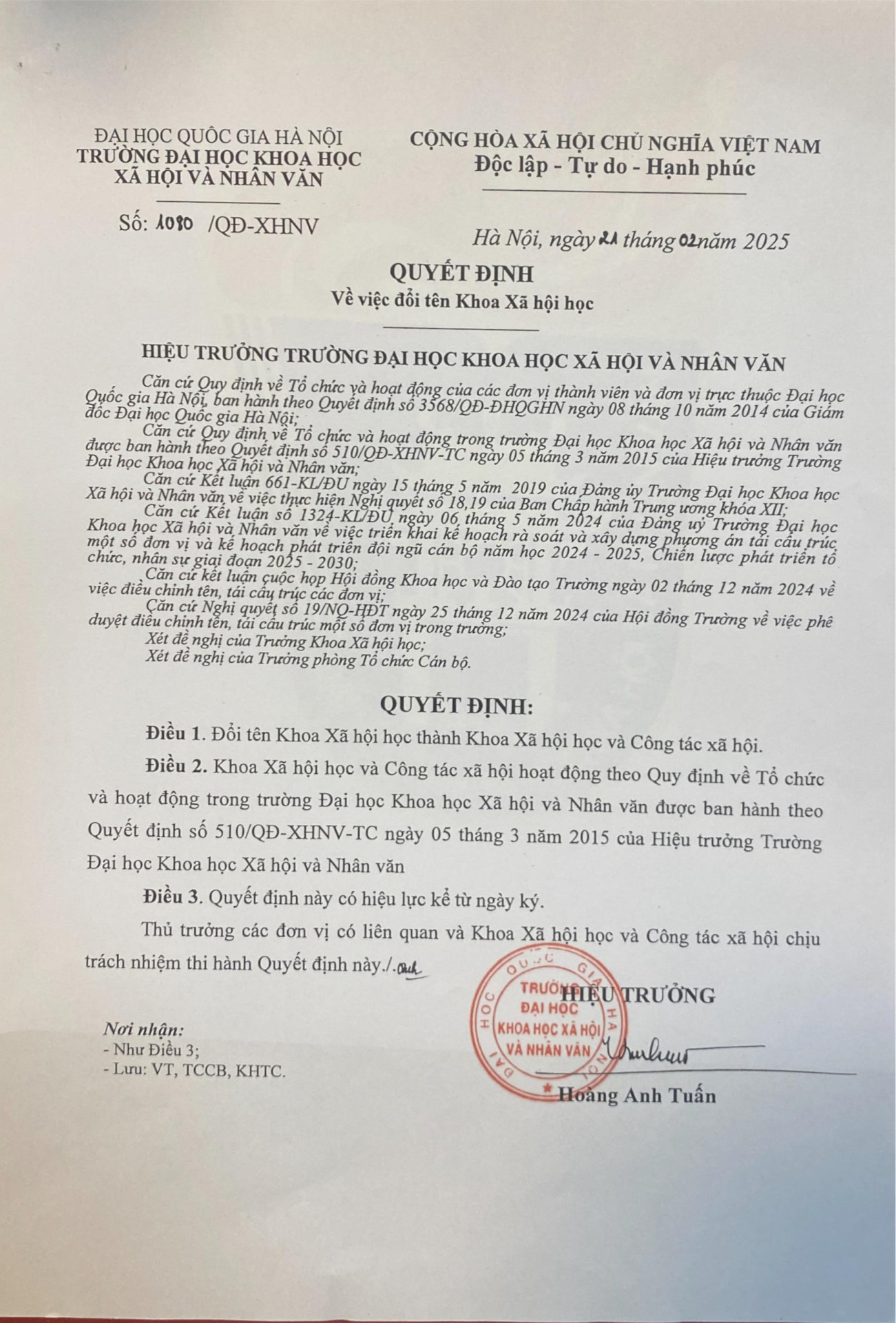 Theo đó, căn cứ quyết định số 1080/QĐ-XHNV ngày 21/02/2025 của Hiệu trưởng Trường Đại học Khoa học Xã hội và Nhân văn, Khoa Xã hội học đã chính thức đổi tên thành Khoa Xã hội học và Công tác Xã hội. Căn cứ theo quyết định số 1081/QĐ-XHNV ngày 21/02/2025 của Hiệu trưởng Trường Đại học Khoa học Xã hội và Nhân văn, TS. Đặng Kim Khánh Ly, Trưởng Khoa Xã hội học tiếp tục giữ chức vụ Trưởng Khoa Xã hội học và Công tác Xã hội.